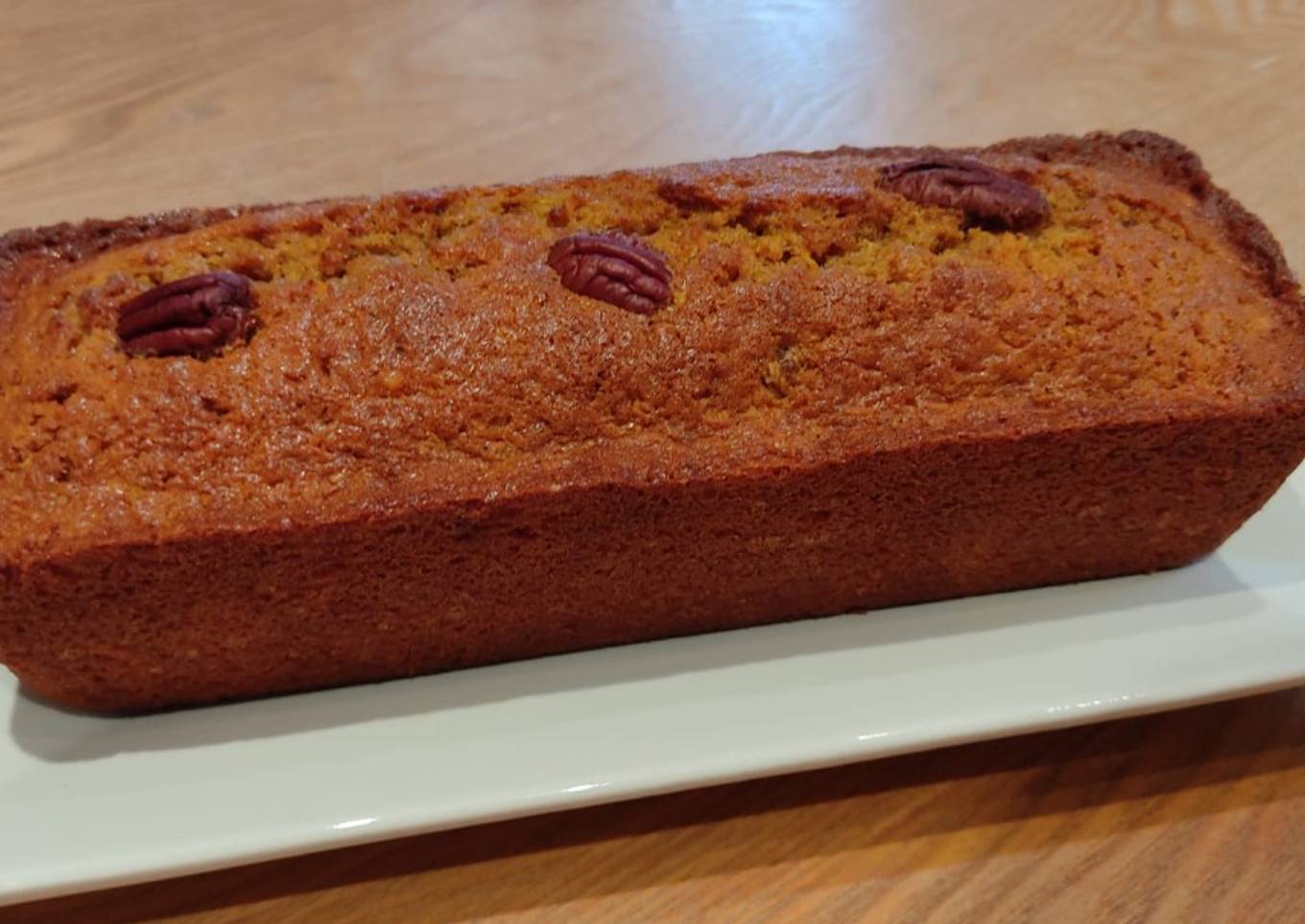- Beurrer le moule et verser la pâte. Mettre 3 noix de pécan dessus. Enfourner pour 45 minutes