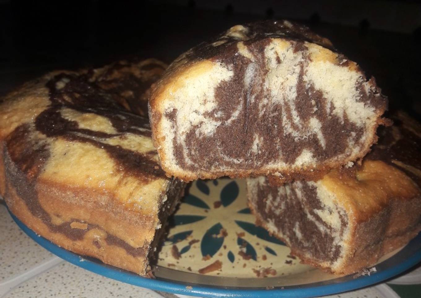 - Beurrer et enfariner un moule et alterné entre un peu de pâte à la vanille et un peu de pâte au cacao puis enfourner.
