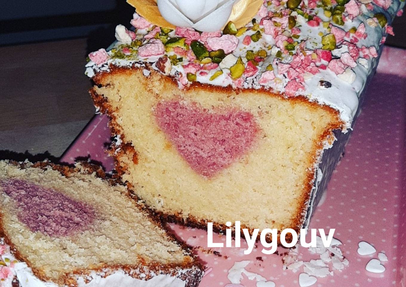 - Faire refroidir le cake rose, puis coupez le en tranches, puis à l'aide d'un emporte-pièce coeur faire des cœurs au milieu de la tranche, puis réservez les.