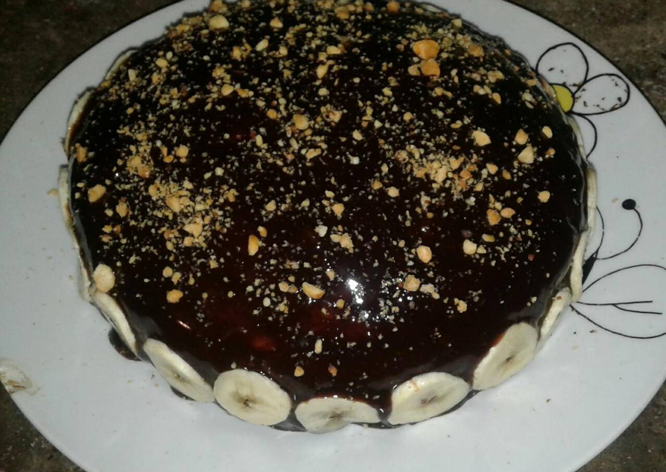 - Dès qu'il sera prête, on verse le chocolat cuit dans un bain marie sur la cake, et on met les cacahuètes râpées, et des petits morceaux de 🍌 banane sous forme des rondelles dans les marges de cake.