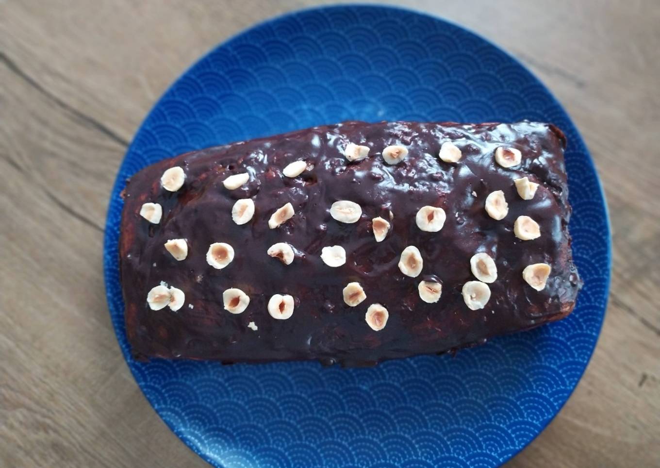 - Faire fondre le chocolat au bain marie nappez le cake de chocolat puis ajoutez les noisettes pour décorer laissez refroidir
