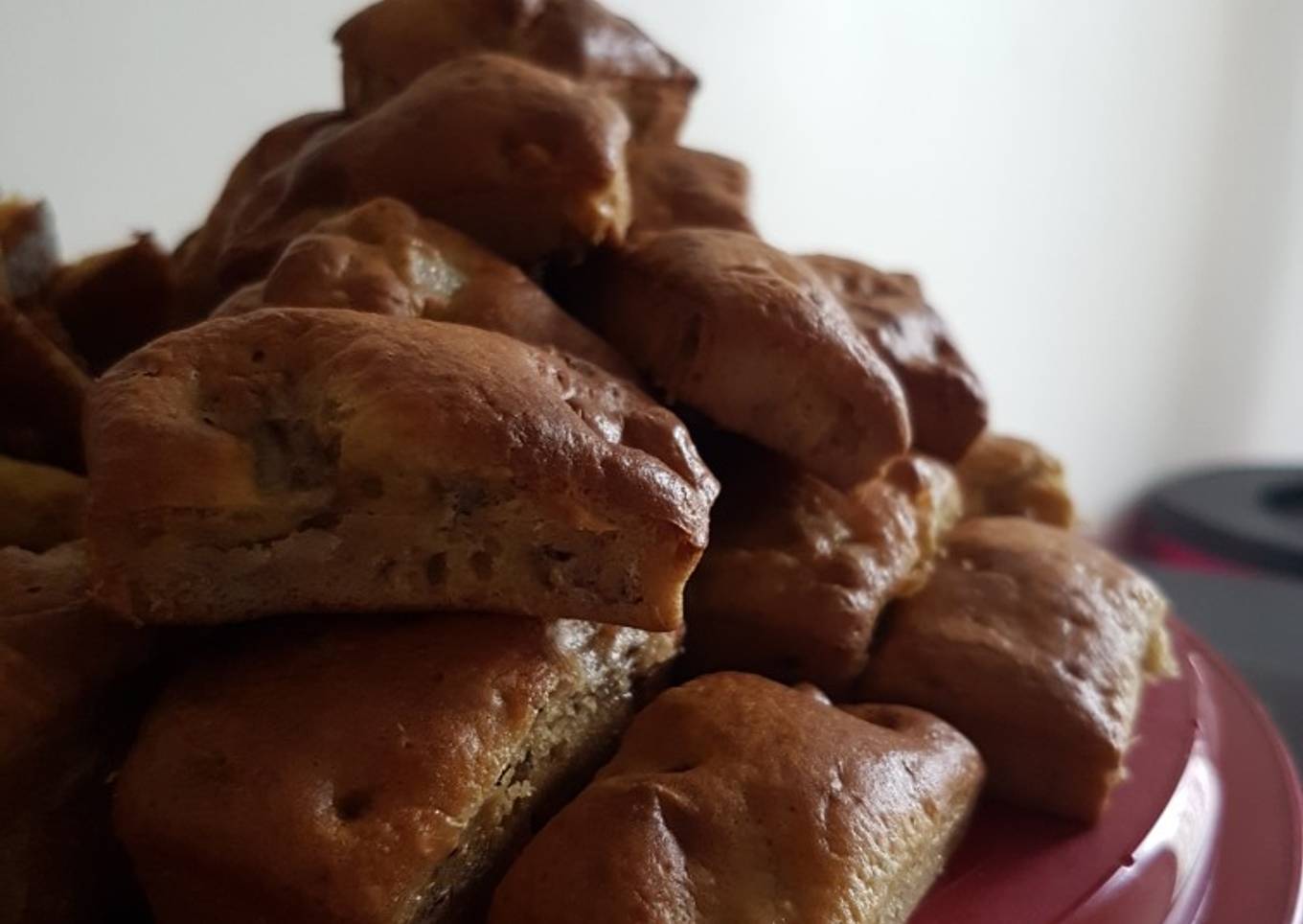 - Préchauffez le four à 180°. Pelez et coupez les bananes en dés et concassez les cerneaux de noix dans un bol.