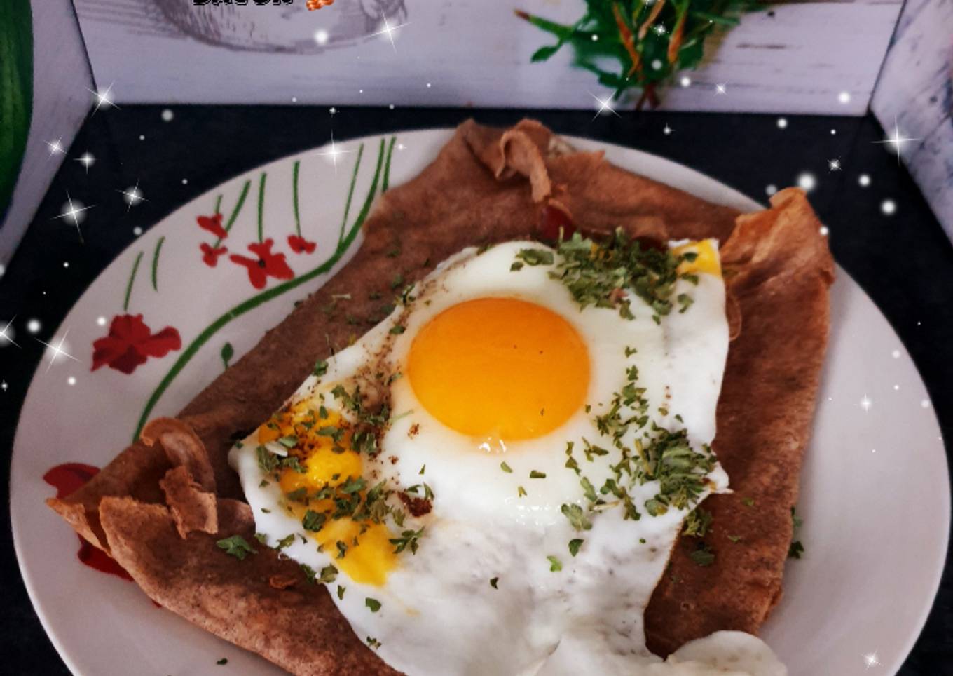 - Faites cuire vos œufs au plat. Salez poivrez. Sortez vos galettes du four, déposer votre œufs au plat dessus. Mettre un peu de persil. Servez immédiatement avec une bonne salade 🥗.
