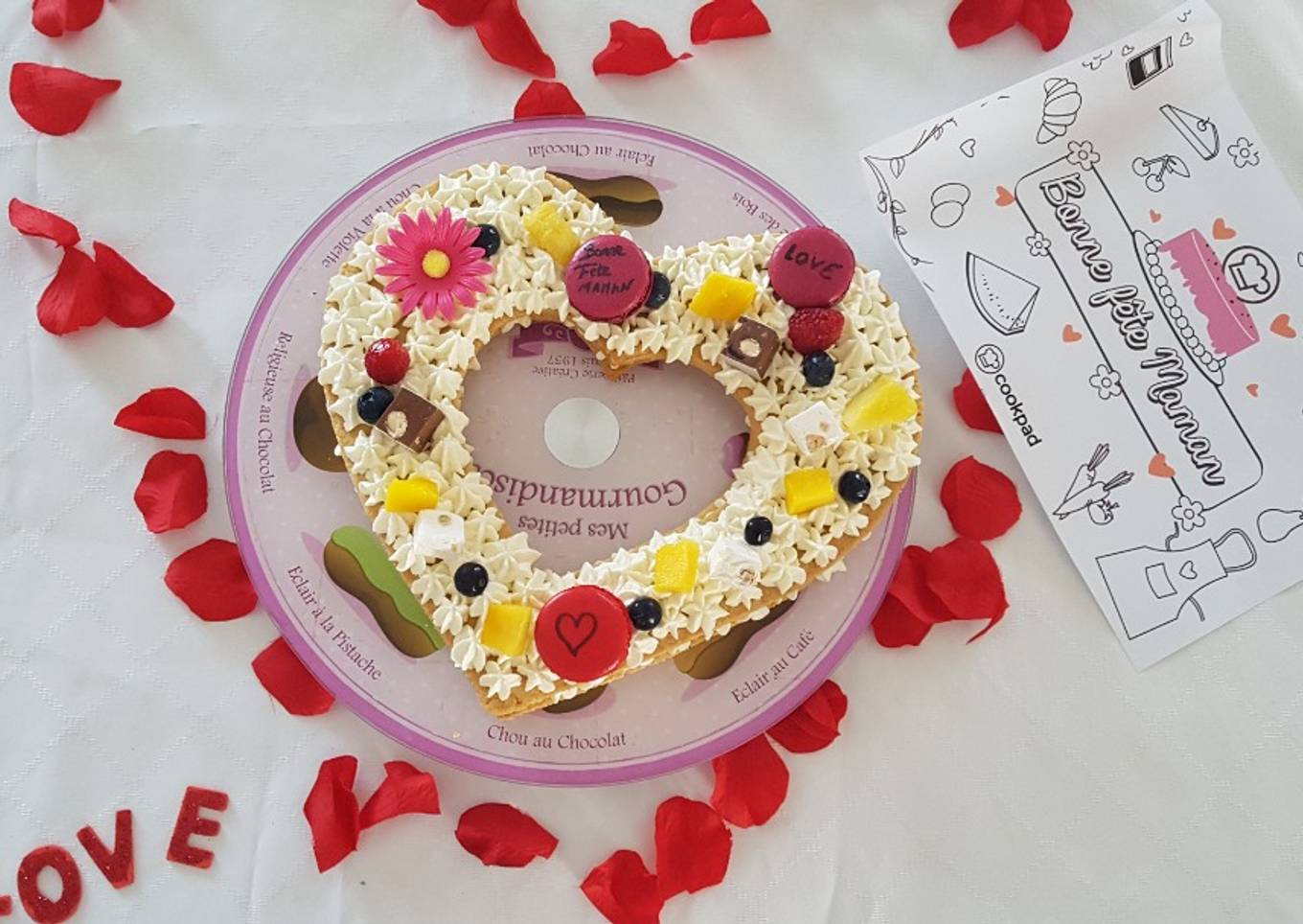 - Positionner le 1er coeur, ajouter a l aide de la douille au choix 1 couche de chantilly. Rajouter le 2eme coeur par dessus le 1er. Rajouter la chantilly et décorer suivant vos goûts (fruits, macarons....)
