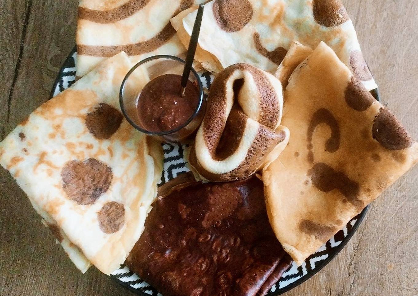 Diviser la pâte en deux puis ajouter le cacao dans l'une des préparations. - Dans une poêle bien chaude faire des petits ronds avec la pâte cacao puis ajouter la pâte blanche pour obtenir une crêpe léopard.