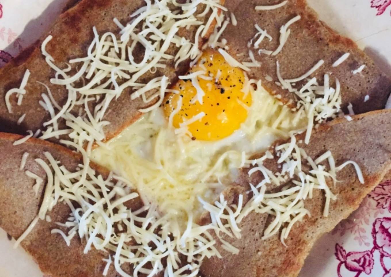 Faire chauffer une poêle légèrement graissée, y verser dessus une louche de pâte, tourner la poêle pour l’étaler, placer au centre un œuf, du fromage râpé autour de l’œuf, saler et poivrer.