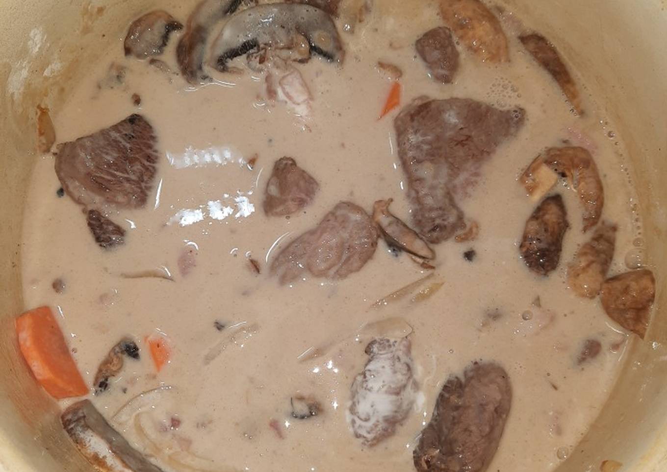 - Lorsque la viande est bien dorés, saupoudrer de farine (60g) et laisser roussir en remuant toujours.